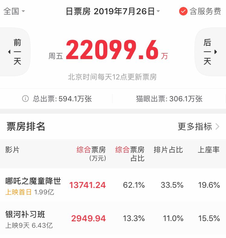 上映第一天(包括之前的点映),《哪吒》就接近了2亿,产出票房高达1.99亿。表现非常抢眼。