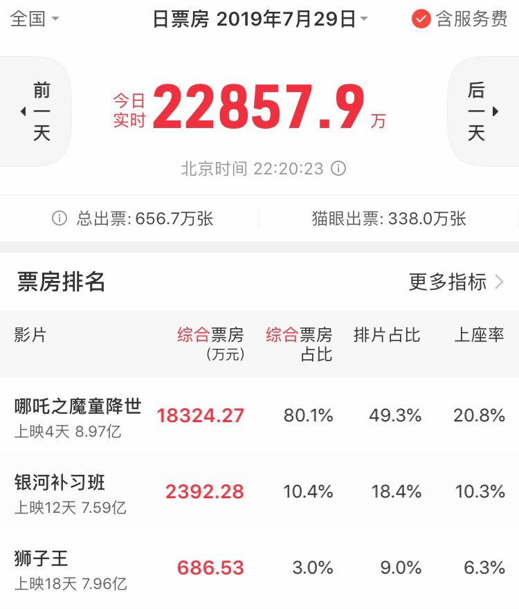 7月29日,电影大盘的票房为2.2857亿。其中《哪吒之魔童降世》单日票房高达1.8亿,直逼2亿大关。而上映四天,《哪吒》的总票房也超过了9亿。对于一部国产动漫电影而言,《哪吒》的火爆简直是难以想象。毫无疑问,《哪吒》将是2019年暑期档最闪耀的国产电影。至于最终票房有多少,至少破20亿应该是没有问题的。有没有可能超30亿呢,目前看来,一切皆有可能。