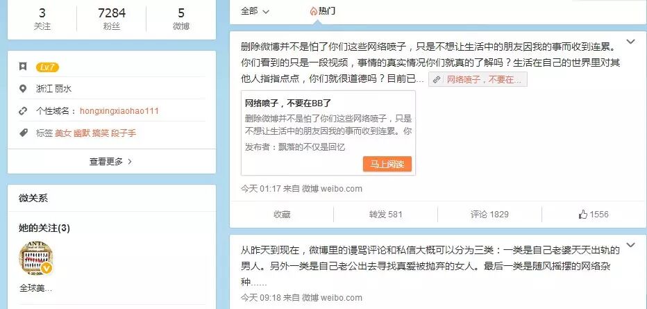 的微博,标签是“幽默”“搞笑”“段子手”,个性域名谐音“红杏小号111”,一看就是一场精心策划的炒作。在这个时代,一些女性为了成为网红,不惜以各种为人不齿的代价,来获得肉体曝光。这,也是女性的悲哀。