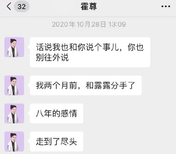 她表示自己被单方面分手,霍尊还对自己进行了冷暴力,并指出霍尊曾约P、出轨,并上贴出霍尊与朋友大尺度的聊天图。
