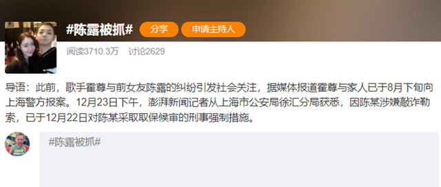 最近一些天,娱乐圈大瓜频现,前脚有王力宏、薇雅,紧接着霍尊前女友陈露因涉嫌敲诈而在12月22号被采取了刑事强制措施,冲上热搜。