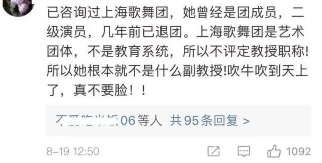 还有网友称自己咨询过上海歌舞团,陈露曾经是团成员,二级演员,几年前已经退团,但上海歌舞团是艺术团体,不是教育系统,不评定职称,所以陈露说自己是“副教授”是吹牛。