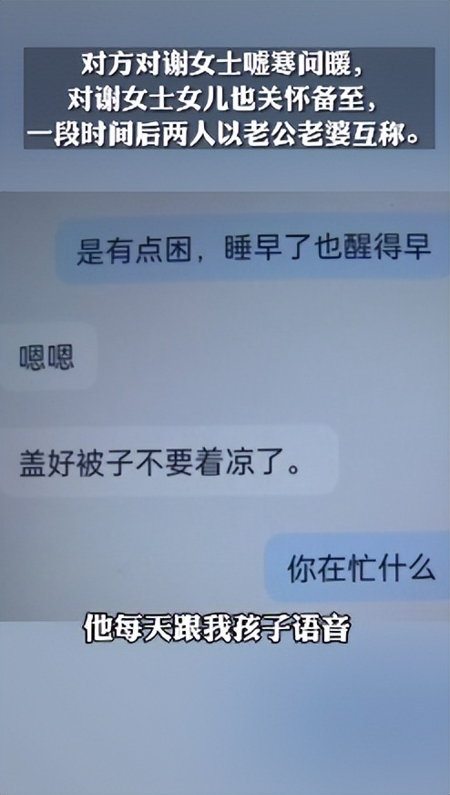 对方非常体贴,对谢女士嘘寒问暖、关怀备注,还每天跟谢女士女儿语音聊天,并自称爸爸,久来就久往,女儿也喜欢上了这位“junguan”叔叔。
