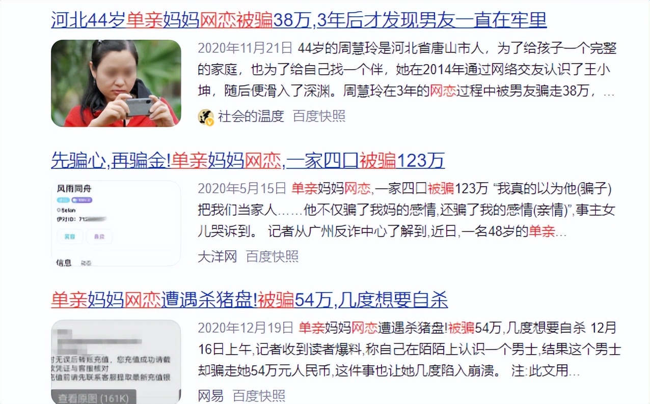 在百度搜索,很多“网恋被骗”的新闻往往都与同一类人群挂钩,“单亲妈妈”。