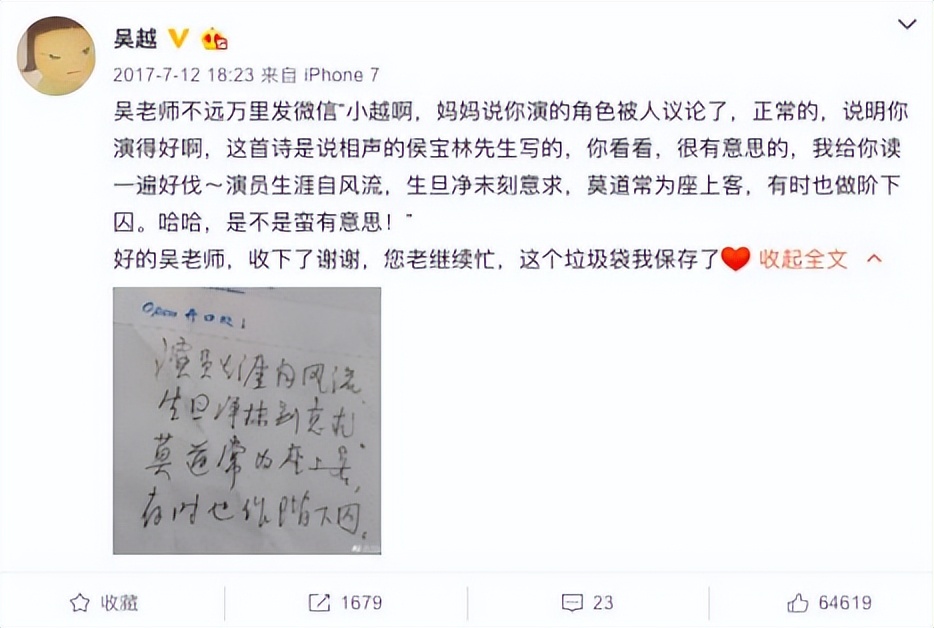 当吴越因为演小三被骂时,她父亲给她写信:演员生涯自风流,生旦净末刻意求,莫道常为坐上客,有时也做阶下囚。