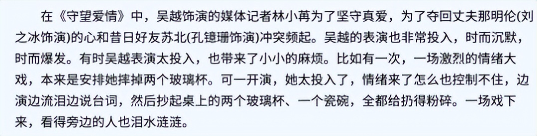 主角林小苒和她有着相似的经历,据友人说,吴越在演戏的时候,情绪来了怎么也控制不住,一边流泪一边说台词,看得身边的人也泪水涟涟。