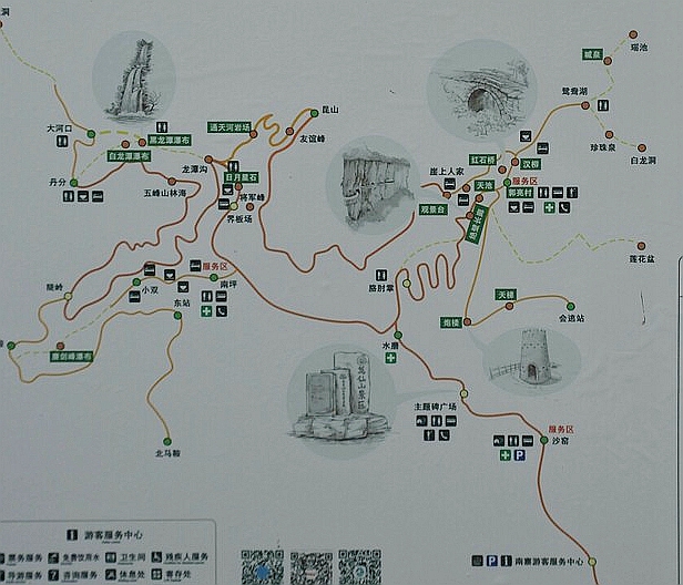 游览黑龙潭、丹分沟景点后回到龙潭沟,耗时约2个半小时,从龙潭沟到 昆山 村关口车程约30分钟,昆山 村属于 山西 陵川 县, 昆山 村关口是 山西 陵川 县和 河南 辉县 二地的地界,二地载客车辆多到此为止不能进入,游客进入必须要买各地的门票,在 郭亮 村的包车只能在这里下,由于不熟悉这个原因,从常青楼到 昆山 村口的200元包车费稍贵了,合理价格在100-150元之间。