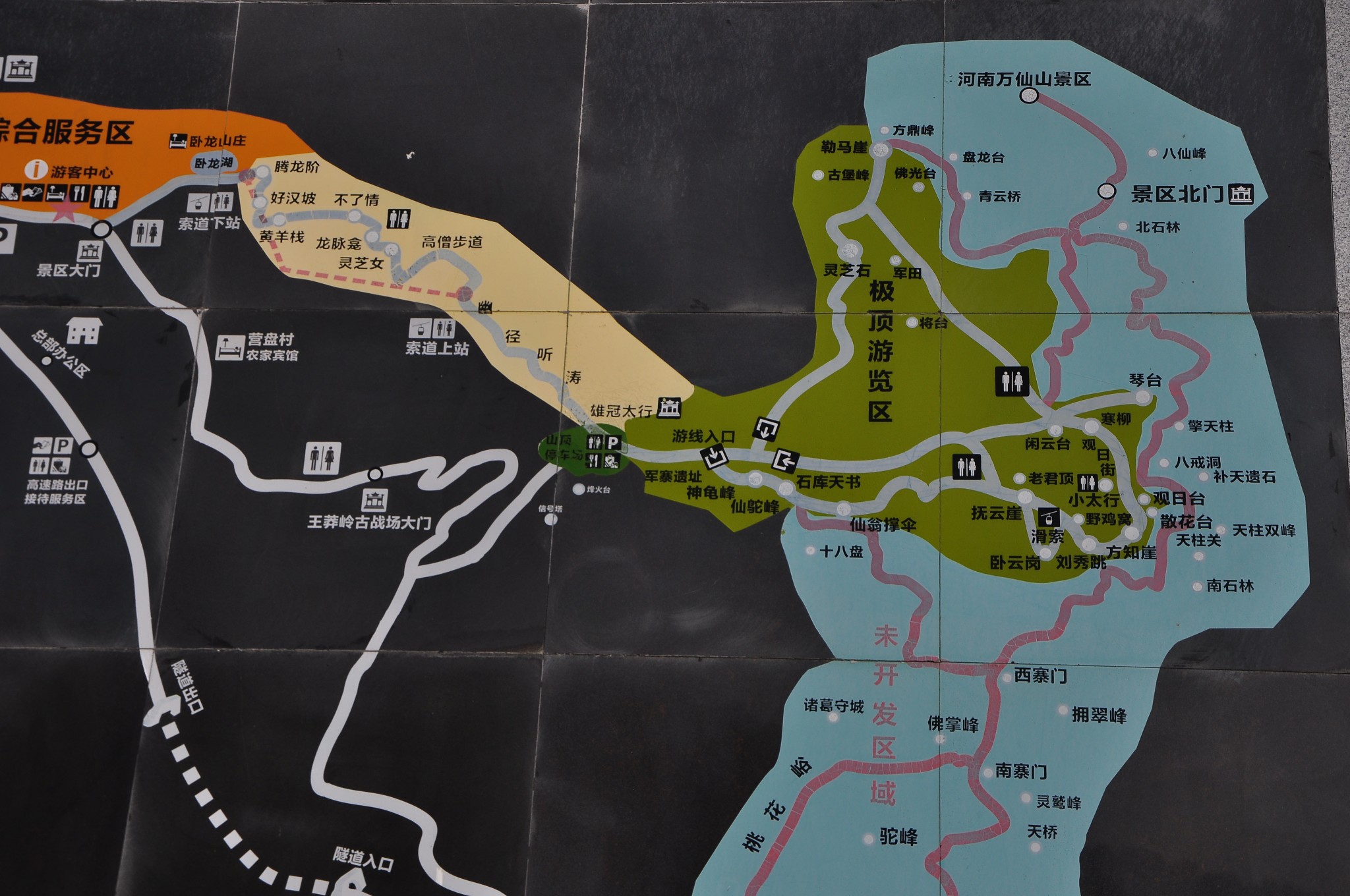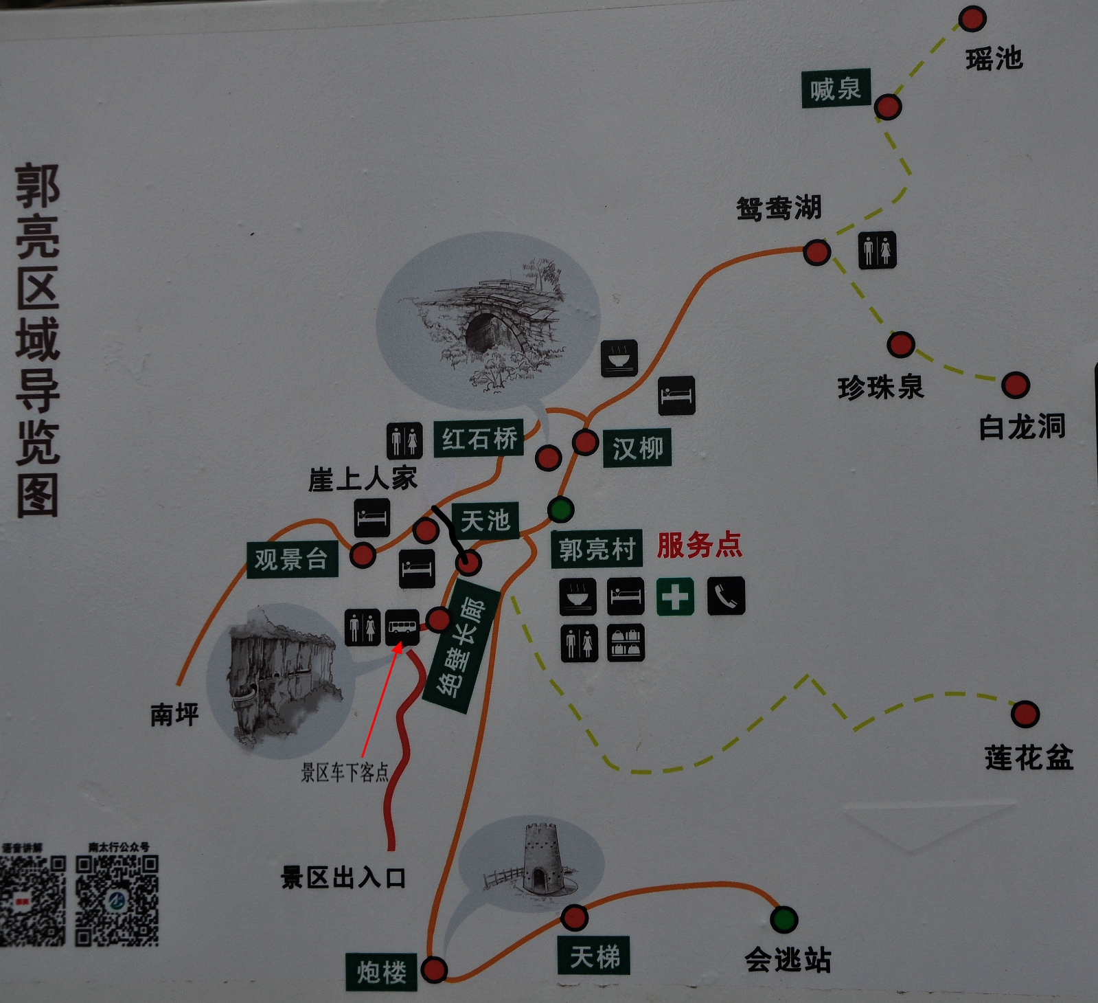 万仙山景区有三部分组成: 郭亮 村、南坪、罗姐寨,万仙山景区门票107元(包含景区车45元,景区车限乘3次),景区门票是磁卡,坐景区车要刷卡,能显示使用次数,景区车运行分三段单向环绕:景区大门(上山)→ 郭亮 村(下山)→ 南坪→景区大门,景区有电瓶车20元。