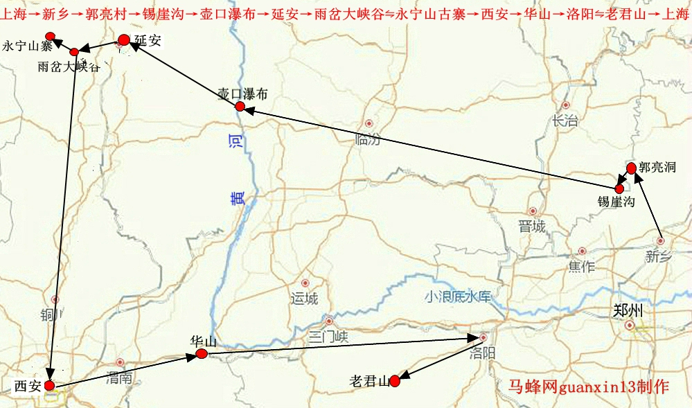 具体线路: 上海 → 新乡 ( 河南 )→ 郭亮 洞( 河南 )→锡崖沟( 山西 )→ 黄河 壶口瀑布 ( 山西 -陕西 )→ 延安 ( 陕西 )→甘泉雨岔大峡谷( 陕西 )⇋ 永宁 山古寨( 陕西 )→ 西安 ( 陕西 )→ 华山 ( 陕西 )→ 洛阳 ( 河南 )⇋老君山( 河南 )→ 上海 ,共13日行程,整个行程采用火车+包车的方式。