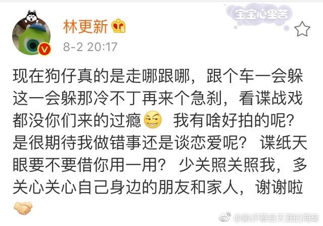 至于大量日常自黑,已经见怪不怪了,甚至林更新还转发视频软件上丑萌大叔的视频,搞笑极了。
