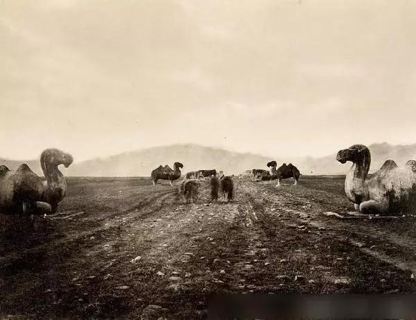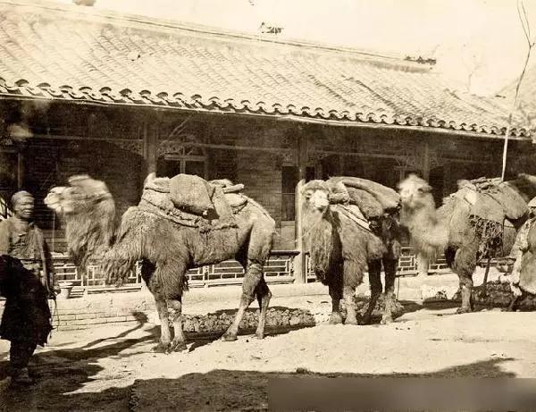 在中国丝绸之路上的一个19世纪旅行者和他们的骆驼。双峰驼,由双驼峰区别,曾被用来“把煤和石灰从西山运到城里,在北京和蒙古间运送商品”