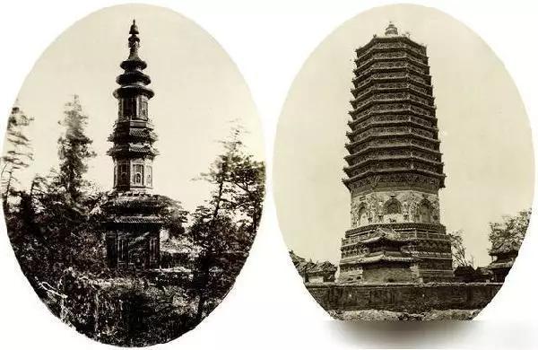 左图:大宗宗祠修道院的香山塔,宝塔饰有黄色,绿色,紫色和蓝色的琉璃瓦。右:天宁寺的十二世纪塔,距离城市西门口几英里。它是首都最古老的建筑之一。像许多辽代塔一样,结构坚实。一座密封的地下室,当建造宝塔时,藏有佛教遗迹,雕像和佛经。