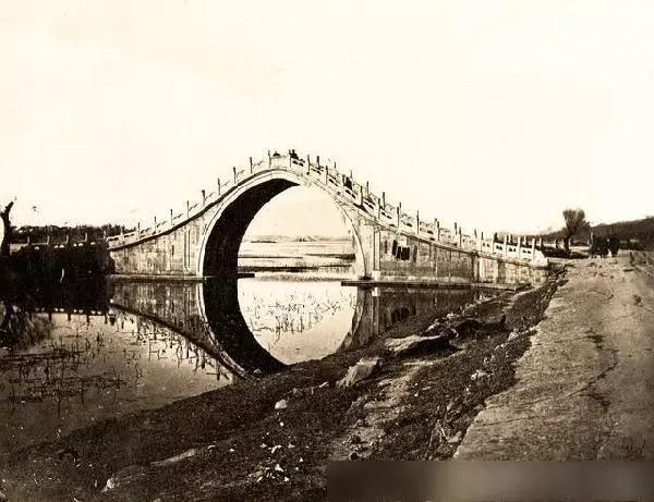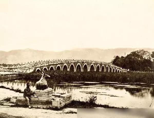 十七拱桥,任何皇家花园的最大的桥梁的视图,在颐和园中。这张桥梁的这张照片包括俯瞰昆明湖的青铜牛。在1755年,青铜牛被定位在湖上,表达防止洪水的希望,因为牛被认为拥有特殊的水力。在密封字符的背面 - 最古老的汉字形式 - 是乾隆皇帝的著名的“金牛铭文” 。