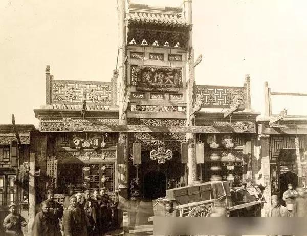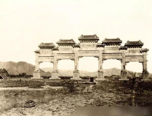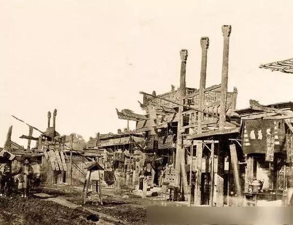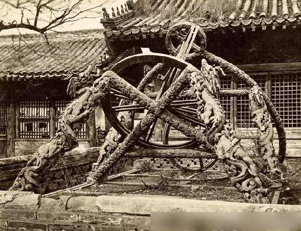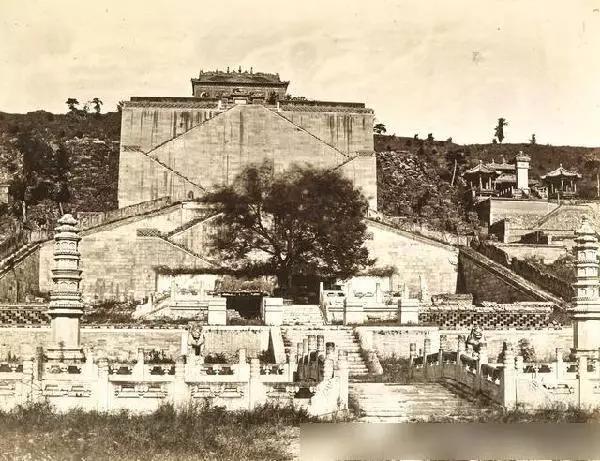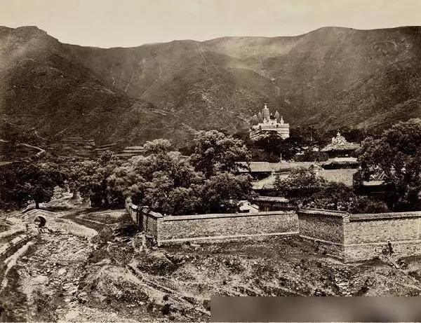 这是唯一已知的碧霞祠庭院的照片。木制建筑围绕着钻石王座塔周围,在义和团战争中被摧毁。