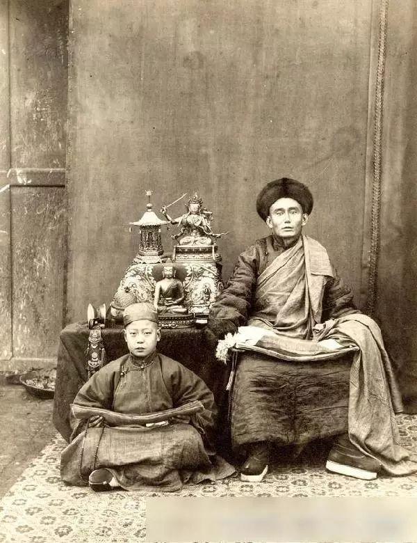 喇嘛”或西藏僧侣的形象和他的学生。二者持念珠和“经典束”或圣经,在他们的裙兜。在他们后面的桌子上,是青铜雕塑和神圣的西藏仪式,包括一个有青铜佛像和曼朱斯里雕像的骷髅杯。