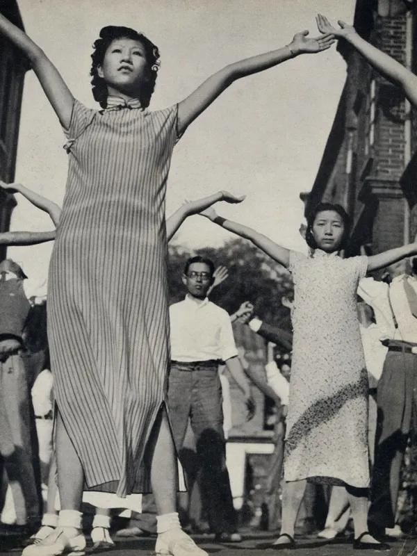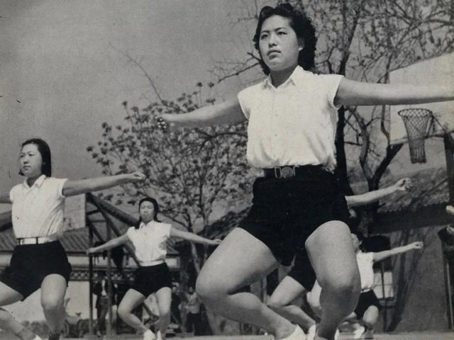 1940年,北京,一所女校的女学生身穿运动服在做体操