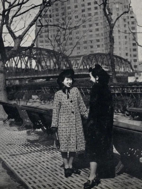 1940年早春,上海午后的街边,两位身穿呢子大衣和裘皮的女性在聊天,画面中的两位女性头戴时尚礼帽,手拿手包,脚穿黑色高跟皮鞋,尽管在当时中国最时尚的城市上海,她们的服饰也显得格外抢眼。