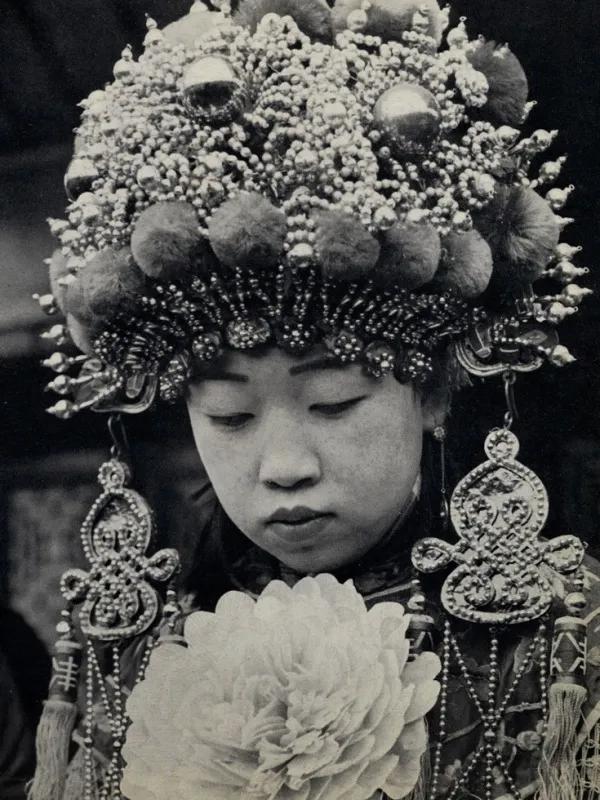 1940年,蒙疆地区,一位汉族女性结婚时头戴凤冠,胸前佩戴一朵牡丹
