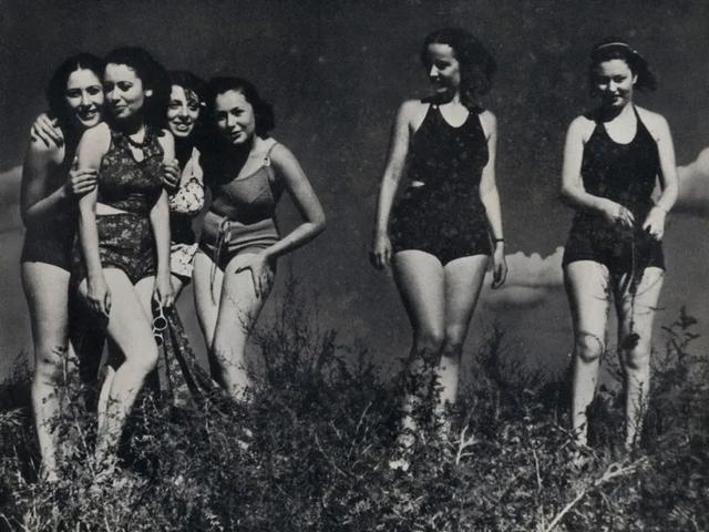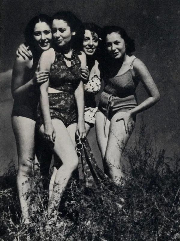 1940年前后,也就是七七事变之后,中国正在进行全面抗战期间,摄影者在中国重点城市记录了很多城市中女性的日常生活细节。图为1940年,哈尔滨,6位欧洲女性身穿泳装站在江边某处