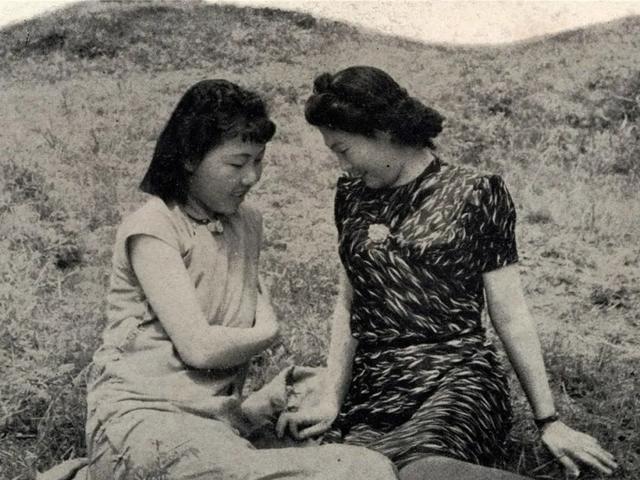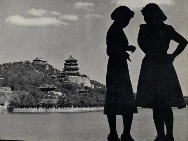 1940年,两位时髦的女性身穿连衣裙和皮鞋站在北京万寿山前的一处长廊上
