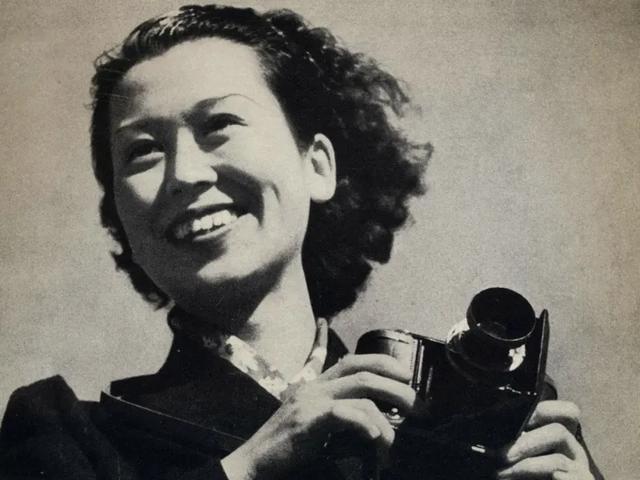 1938年左右,一位女士手拿折叠式相机的照片成为当时日本相机的广告