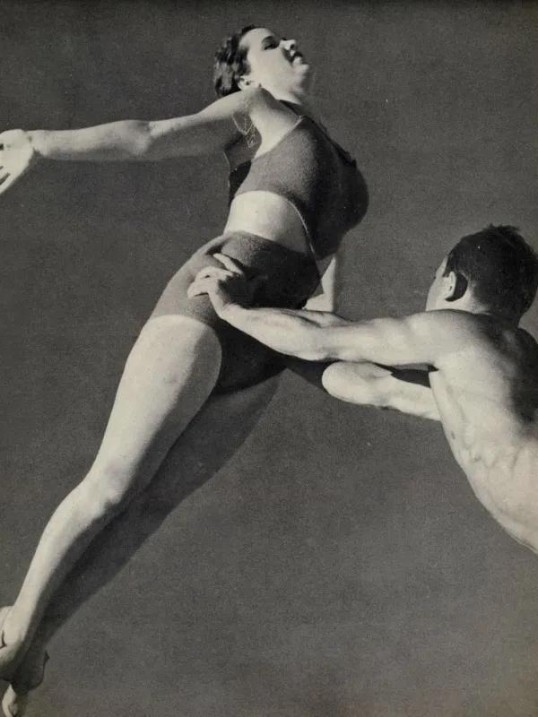 1940年,哈尔滨的太阳岛,一位赤裸上身的男士托举起一位身穿泳装的女士,他们正在表演“飞翔”。