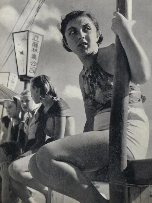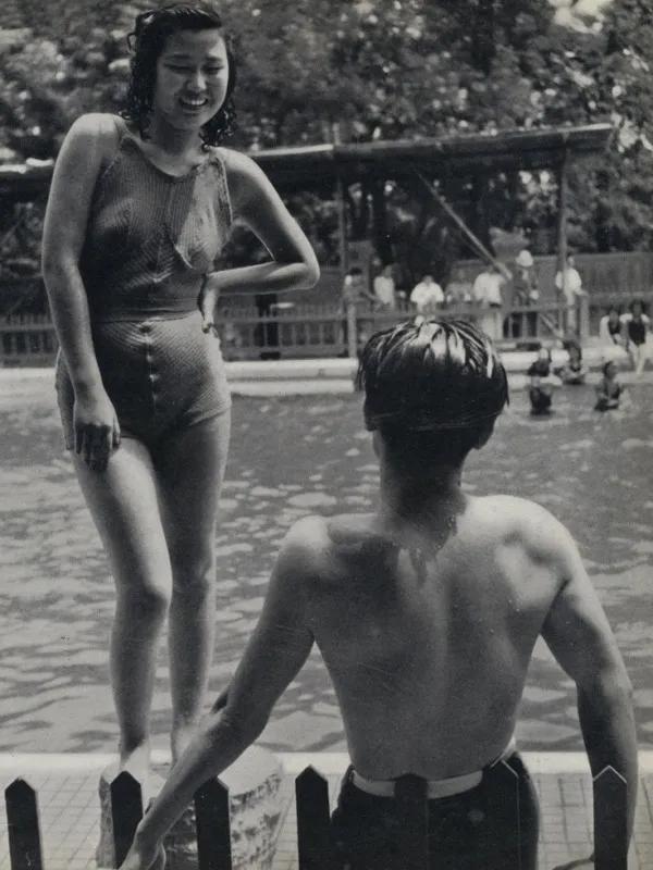 1940年,北京中南海公园的游泳池边,一位身穿泳装的女性正在与一位男士聊天