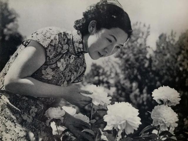 1940年6月,一位身穿旗袍的女性在公园欣赏牡丹