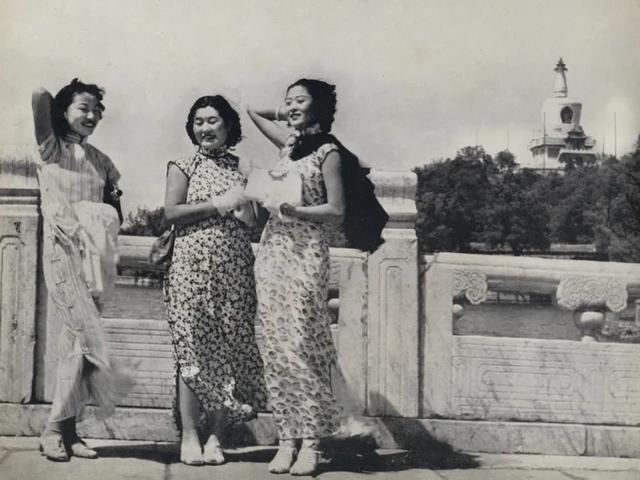 1940年,三位女士身穿旗袍站在北京北海的一处石桥上