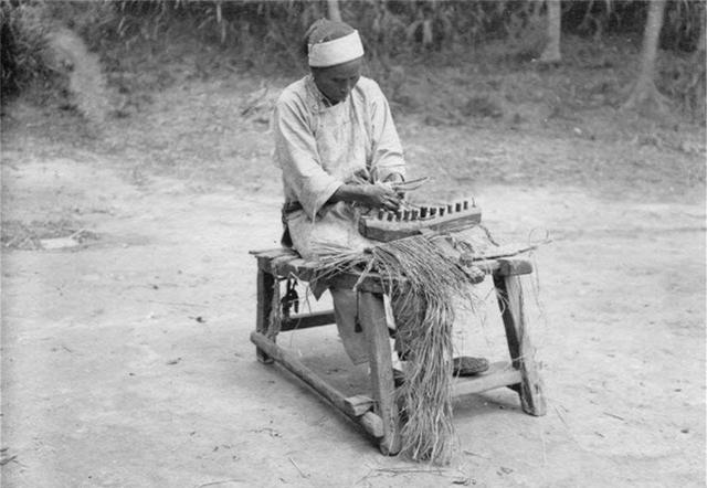 晚清老照片:9、清朝的老百姓生活情景照。清朝妇人用稻草编织草鞋。
