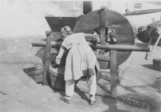 晚清老照片:清朝的老百姓生活情景照。4、中国人最古老的碾米方式。贫穷人家的小孩帮助大人拉磨碾米。