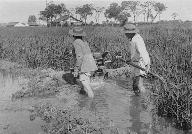 清末民初历史老照片:8、农民人工给水泵,这种是用手制动的,还有用脚踩的。农民将水从小沟里运输到自己的稻田里。