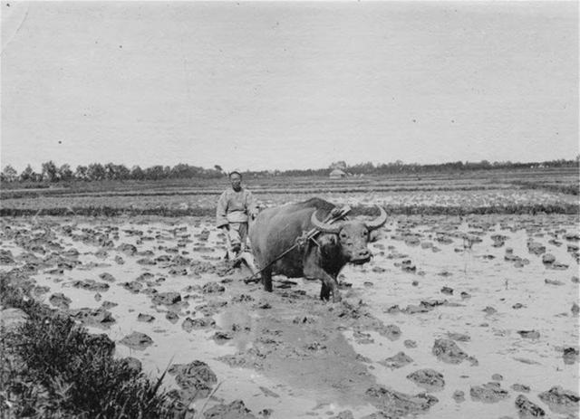 清末历史老照片:7、大水牛瞪着大眼睛耕地,农民全靠一亩三分地,为了来年有个好收成。这耕田的犁,我爷爷现在还有。