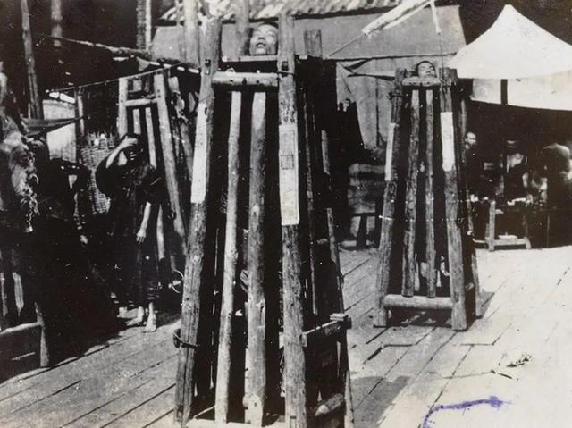 这张照片记录的内容,是晚清执行“站笼”刑罚的情景。