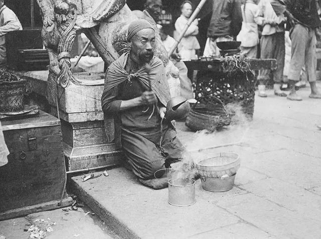 老汉敲着木鱼,希望能引起行人注意,为他提供一点裹腹的口粮。