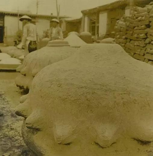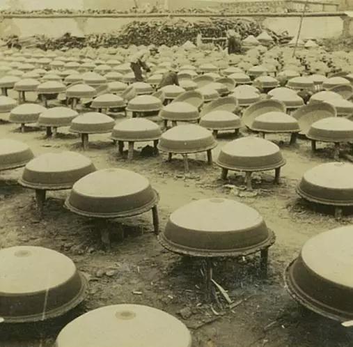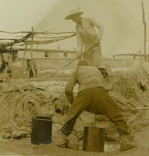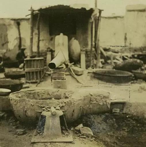 这些照片拍摄于1941年,是河北唐山地区的一家铁锅厂,小作坊,很脏乱。不过,它的生产链倒是很齐全。除了铁锭要买之外,其它全是自己做啊。现在我们就仔细看看吧,这里应该是用和好的泥巴做模子。