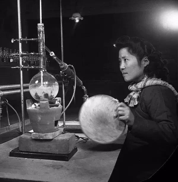 1944年2月,四川成都,金陵女大华西坝化学系试验课,由于没有酒精,做实验时只能用炭炉代替酒精灯。孙明经/摄。
