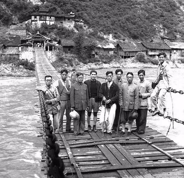 1939年7月,川康科学考察团地理组在泸定桥上留影,左五为孙明经。孙明经/摄。