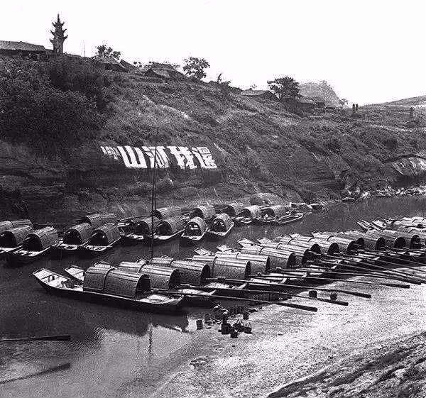 1938年4月,四川自贡,釜溪河中的运盐船及岸边崖坡上的“还我河山”的标语。孙明经/摄。