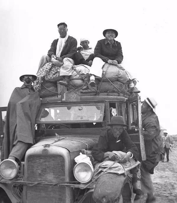 1937年7月15日,旅途中的西北科学考察团在包五路上。人多车小,有的团员们只能坐在车顶和站在车边。孙明经/摄。