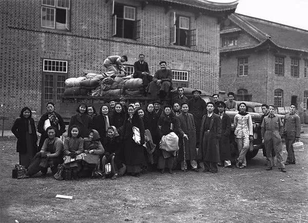 1946年1月,四川成都,抗战胜利后金陵大学师生分批复员南京,第一批复员回南京的金陵大学师生出发前在成都华西坝留影。孙明经/摄。