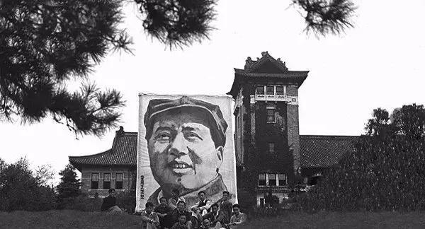 1949年5月,南京第一幅毛主席巨幅画像,金陵大学影音部杨赞南教授遵孙明经主任安排绘成的巨幅毛主席像。孙明经/摄。