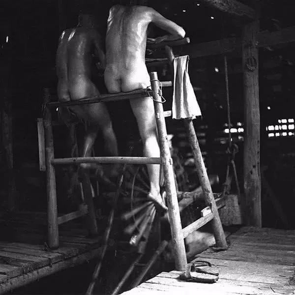 1938年4月,四川自贡,车盐水的工人极为苦累,工作时一丝不挂浑身汗湿。孙明经/摄。