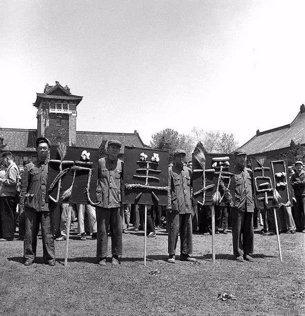 1951年5月1日,金陵大学工会全体会员出发参加五一劳动节游行,农学院的标语与众不同,用农作物制成的"抗美援朝"。孙明经/摄。