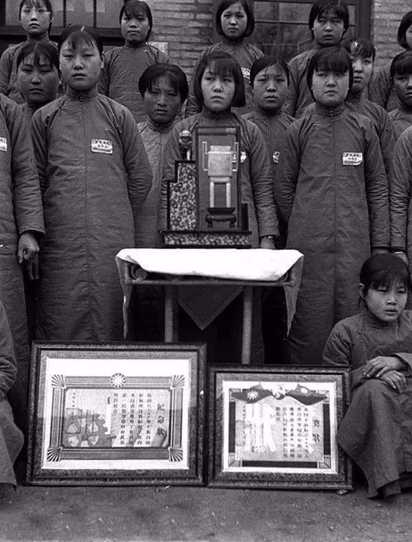 1937年3月,烟台蚕丝改良委员会青年女工工读学会与所获奖状合影。孙明经/摄。