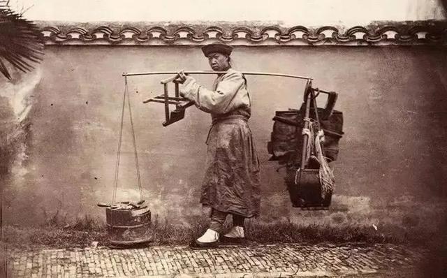一个挑着担子、走街串巷卖手工艺品的老人,眼中充满愁苦。