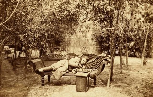 鸦片让当时的中国人被称为“东亚病夫”,照片上是一个富家公子躺在椅子上吸大烟。