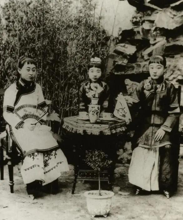 三位汉族上层女性,她们肥大裤脚下露出鞋尖,可想象双足之纤小。小小三寸金莲,却是用身体和心灵遭受的摧残换来的。