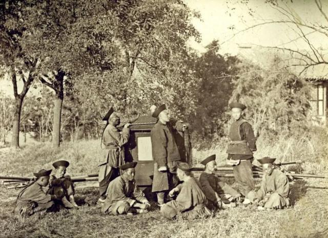 轿夫坐在草地上等待官员,当时官员出行,都要五六个人抬轿子。