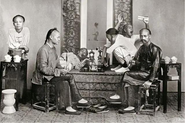 晚清世风日下,正在鸦片馆抽烟的几名男子,旁边还有专门的小弟服侍。有的躺着有的坐着,还有一个抽的哈欠连天,一身倦意。